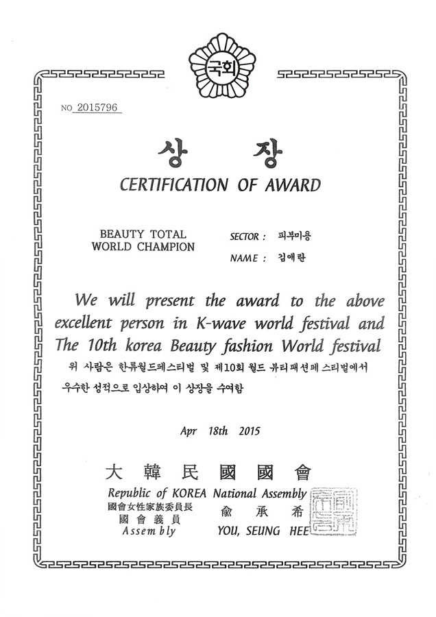 대한민국 국회 뷰티 토탈 월드 참피온상 수상 피부미용 부분 김애란님