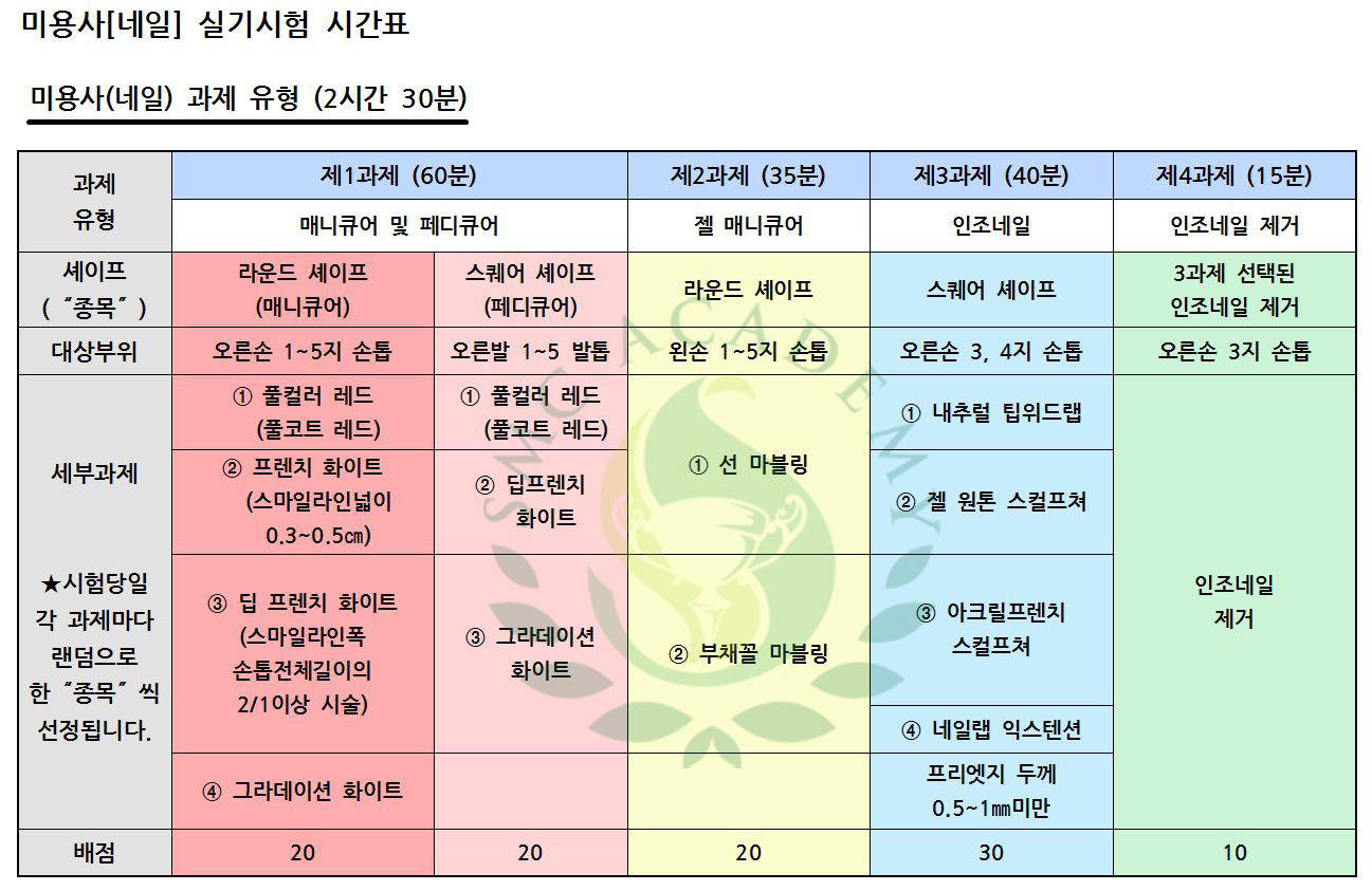 네일미용사 실기시험 시간표 및 과제 유형입니다.