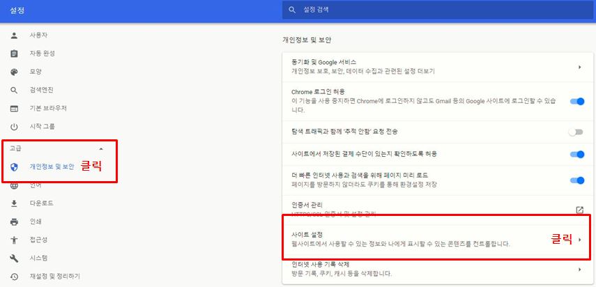 3. 고급 클릭 → 개인정보 및 보안 클릭 → 사이트 설정 클릭해주세요.